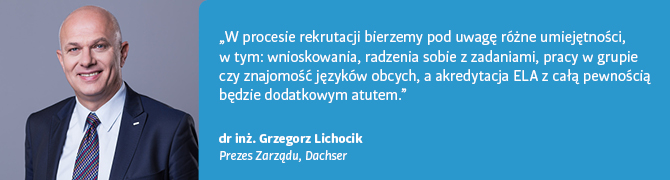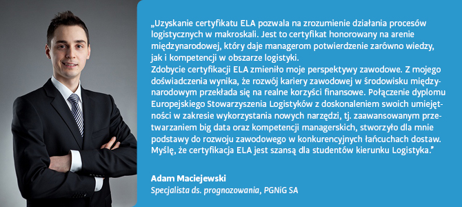 Adam Maciejewski, obecnie specjalista ds. prognozowania zapotrzebowania na gaz ziemny w skali kraju PGNiG SA, którego doświadczenie zawodowe obejmuje kilkuletni staż pracy na Słowacji, w środowisku międzynarodowym, w obszarze planowaniem dystrybucji w globalnym łańcuchu dostaw, następnie stanowisko managerskie w Centrum Planowania Procter&Gamble jako osoba odpowiedzialna za wdrażanie produktów wchodzących na rynek, tak mówi o roli certyfikacji ELA na ścieżce rozwoju zawodowego: