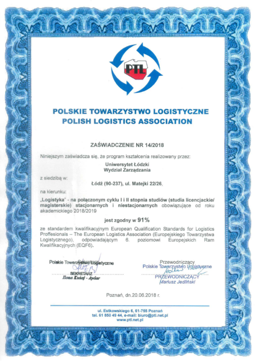 Programy studiów I i II stopnia są dostosowane do najnowszych światowych standardów kształcenia w zakresie logistyki oraz zarządzania łańcuchem dostaw. Absolwenci, którzy po zakończeniu studiów I stopnia na kierunku Logistyka kontynuowali je na II stopniu o specjalności Zarządzanie Łańcuchem Dostaw i uzyskali średnią ocen z przedmiotów realizujących standardy ELA nie niższą niż 4,0 mają prawo do przystąpienia do procesu certyfikacji Candidate European Senior Logistician. Certyfikat jest międzynarodowym potwierdzeniem zdobytej na Uniwersytecie Łódzkim wiedzy. Certyfikaty Candidate European Senior Logistician (cESLog) wydawane są na okres 5 lat. Certyfikacja cESLog dotyczy studentów, którzy rozpoczęli studia I stopnia na kierunku Logistyka w roku akademickim 2018/2019.