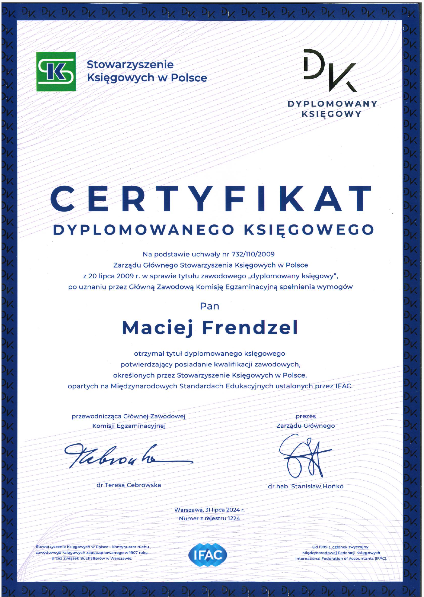 Z wielką radością informujemy, że dr Maciej Frendzel pomyślnie uzyskał certyfikat Dyplomowanego Księgowego, potwierdzający wysokie kompetencje zawodowe określone przez Stowarzyszenie Księgowych w Polsce.