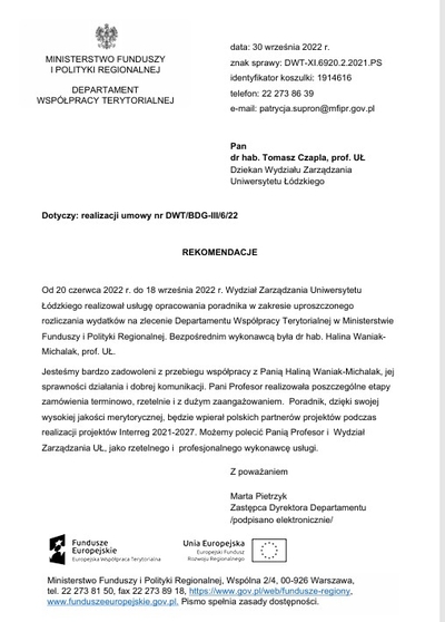 Od 20 czerwca 2022 r. do 18 września 2022 r. Wydział Zarządzania Uniwersytetu Łódzkiego realizował usługę opracowania poradnika w zakresie uproszczonego rozliczania wydatków na zlecenie Departamentu Współpracy Terytorialnej w Ministerstwie Funduszy i Polityki Regionalnej. Bezpośrednim wykonawcą była dr hab. Halina Waniak-Michalak, prof. UŁ. Jesteśmy bardzo zadowoleni z przebiegu współpracy z Panią Haliną Waniak-Michalak, jej sprawności działania i dobrej komunikacji. Pani Profesor realizowała poszczególne etapy zamówienia terminowo, rzetelnie i z dużym zaangażowaniem. Poradnik, dzięki swojej realizacji projektów Interreg 2021-2027. Możemy polecić Panią Profesor i Wydział Zarządzania UŁ, jako rzetelnego i profesjonalnego wykonawcę usługi.