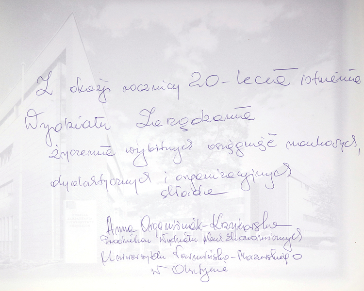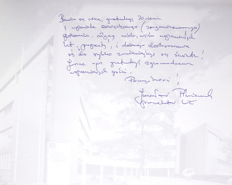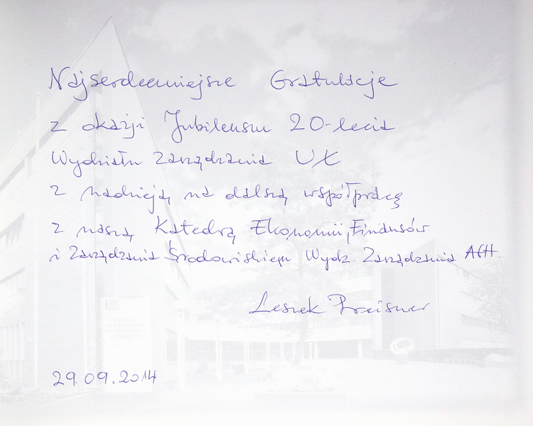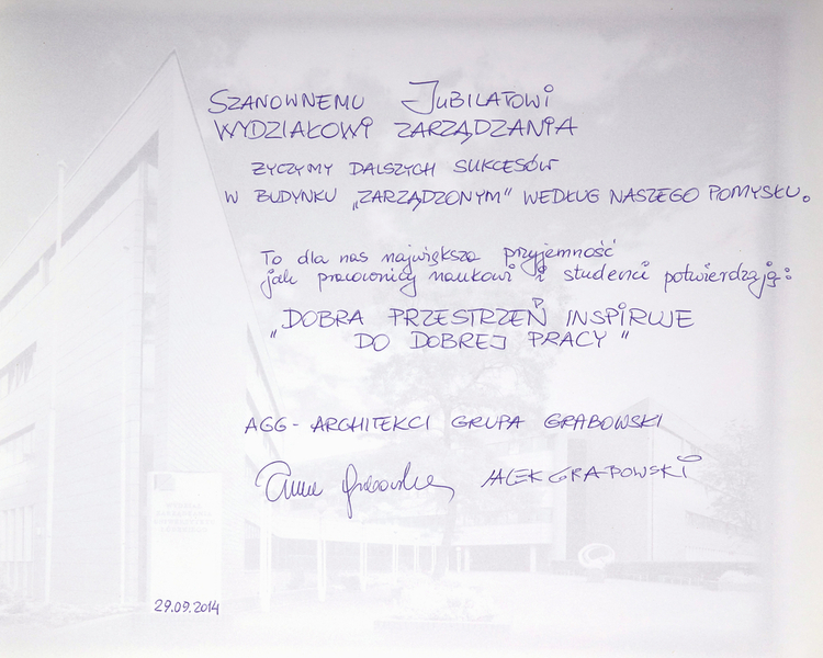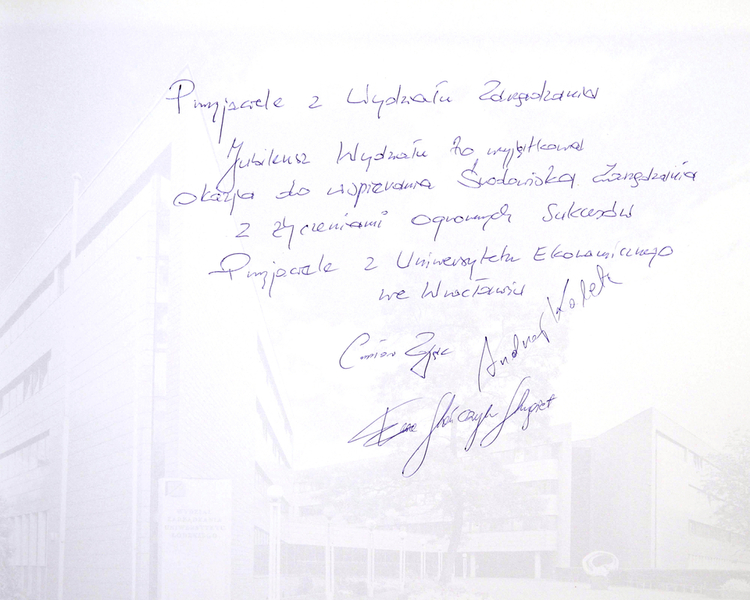 Z okazji jubileuszu Wydziału Zarządzania, wszystkim obecnym i byłym władzom, pracownikom i studentom pragnę złożyć serdecznie gratulacje i życzyć dalszych sukcesów na niwie naukowej, dydaktycznej i współpracy z otoczeniem społeczno-gospodarczym.
