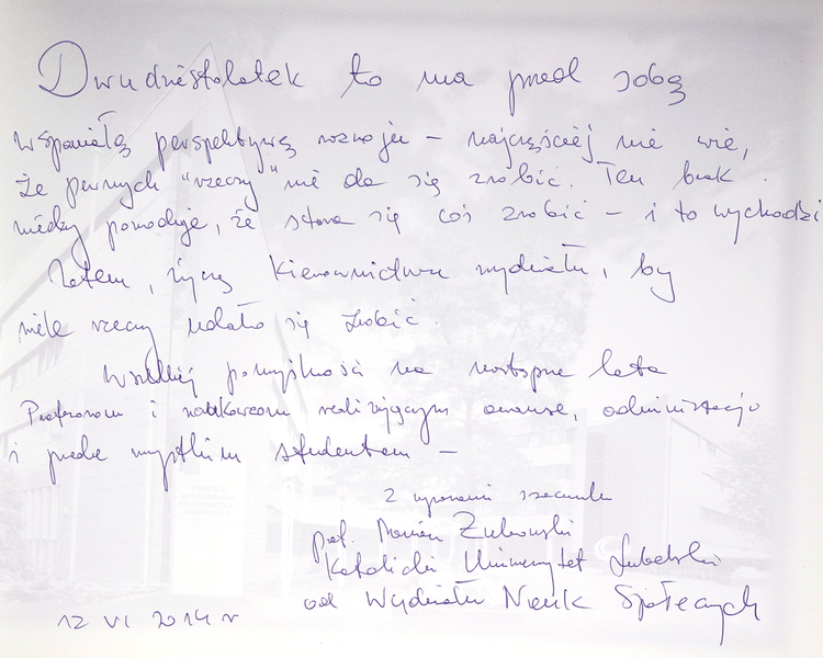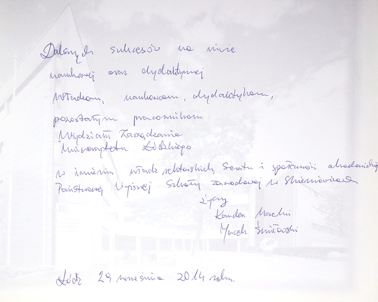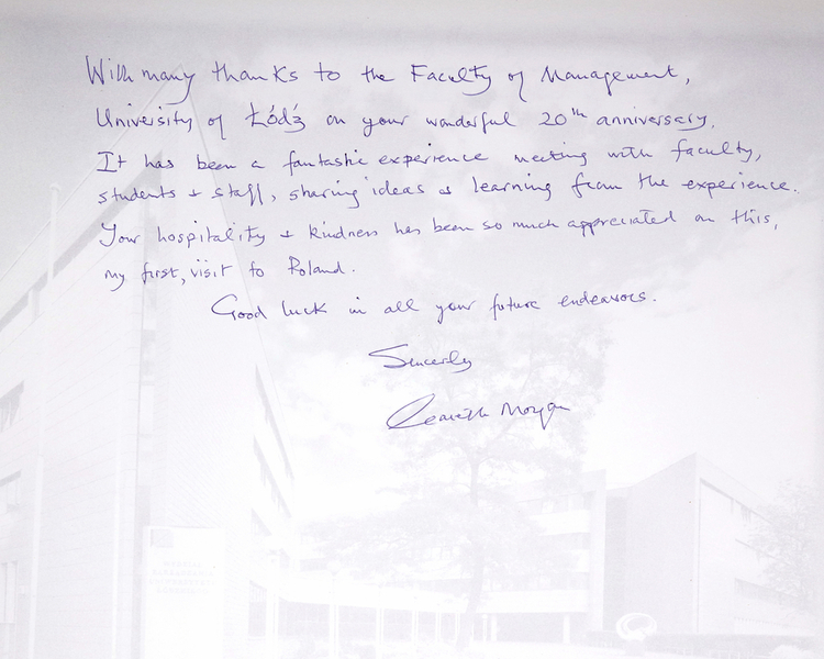 Każda rocznica to nie tylko czas retrospekcji, ale też moment popatrzenia w przyszłość i podjęcia wyzwań. Życzę, aby Państwa Wydział w kolejnym trzydziestoleciu, nie tylko utrzymał, ale jeszcze powiększył swoje osiągnięcia i renomę na arenie krajowej i międzynarodowej. Wszystkim pracownikom życzę wielu sukcesów osobistych i naukowych, szybkich awansów i wiele przyjemności z pracy naukowej i dydaktyki oraz dumy z bycia pracownikiem Wydziału Zarządzania Uniwersytetu Łódzkiego.