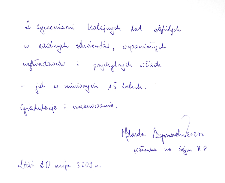 Z okazji pięknego Jubileuszu 30-lecia Wydziału Zarządzania Uniwersytetu Łódzkiego pragnę złożyć gratulacje i wyrazy szacunku oraz uznania dla imponujących osiągnięć. Proszę o przyjęcie życzeń kolejnych sukcesów i dalszego rozwoju oraz satysfakcji z dokonań.