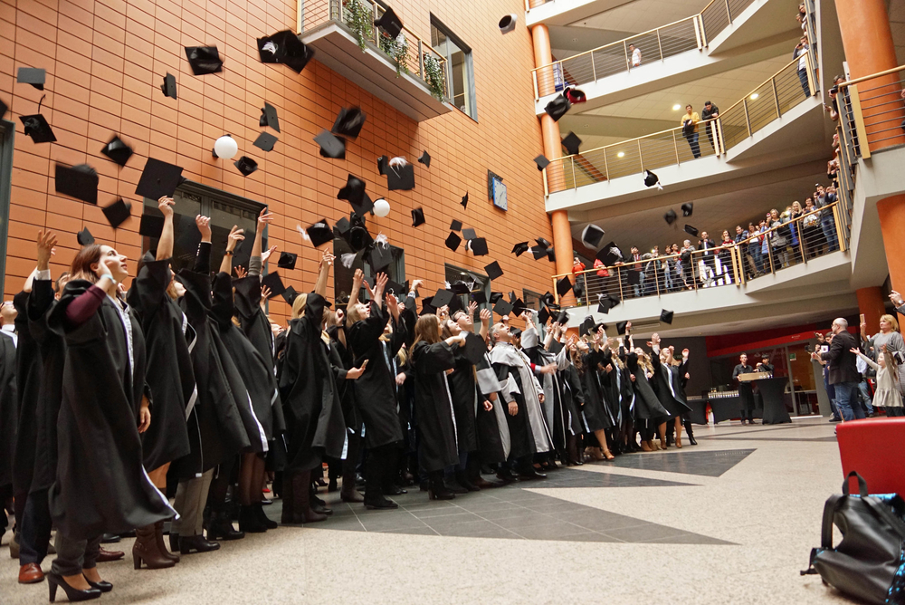 Ostatnim punktem uroczystości było wspólne zdjęcie absolwentów zgromadzonych na wydziałowym patio w momencie podrzucania biretów oraz toast wieńczący Galę Absolwenta 2017.