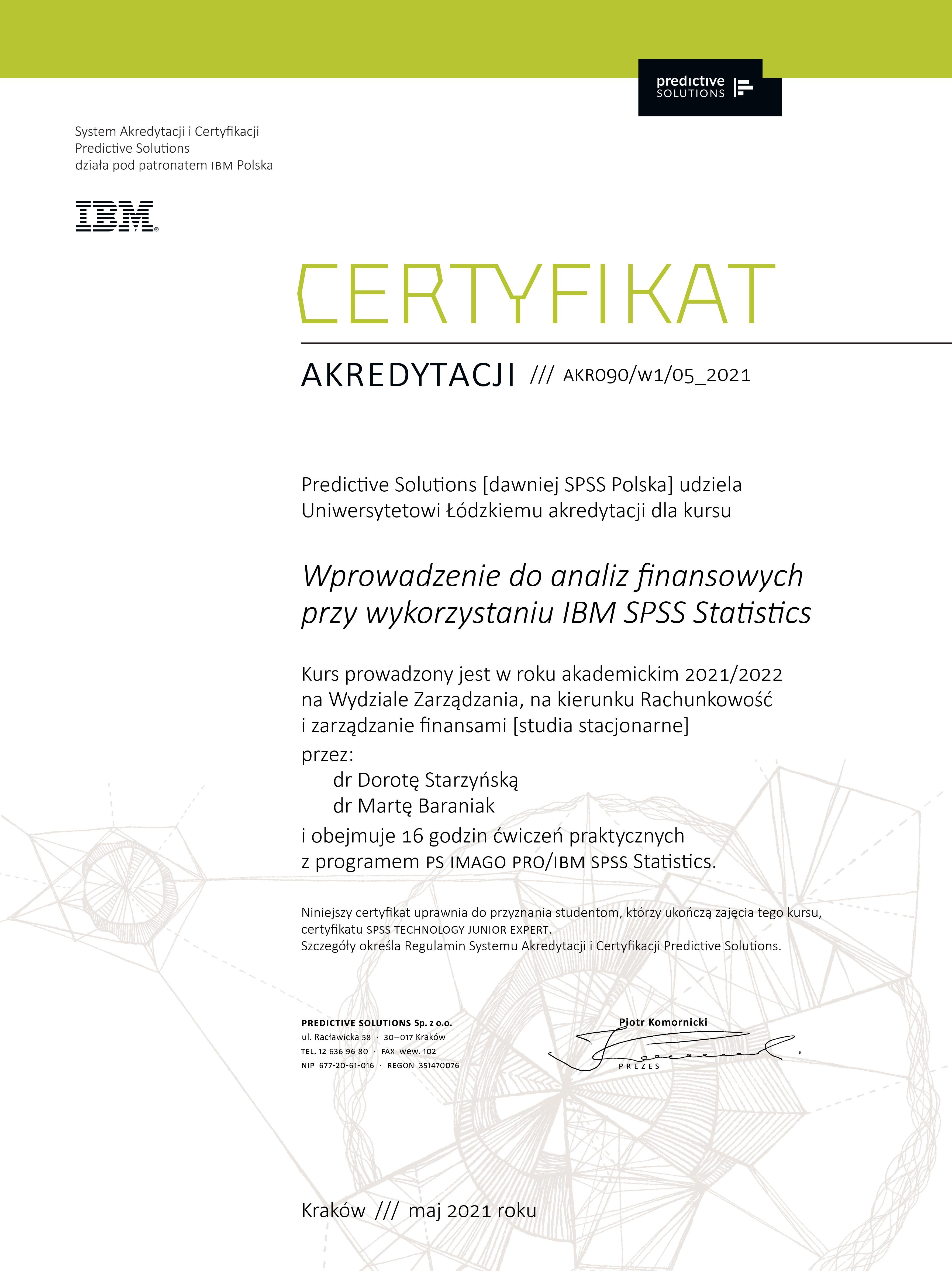 Miło nam zakomunikować, iż od roku akademickiego 2021/2022 przedmiot „Wprowadzenie do analiz finansowych przy wykorzystaniu IBM SPSS Statistics”, został objęty systemem akredytacji zajęć dydaktycznych Predictive Solutions [dawniej: SPSS Polska].