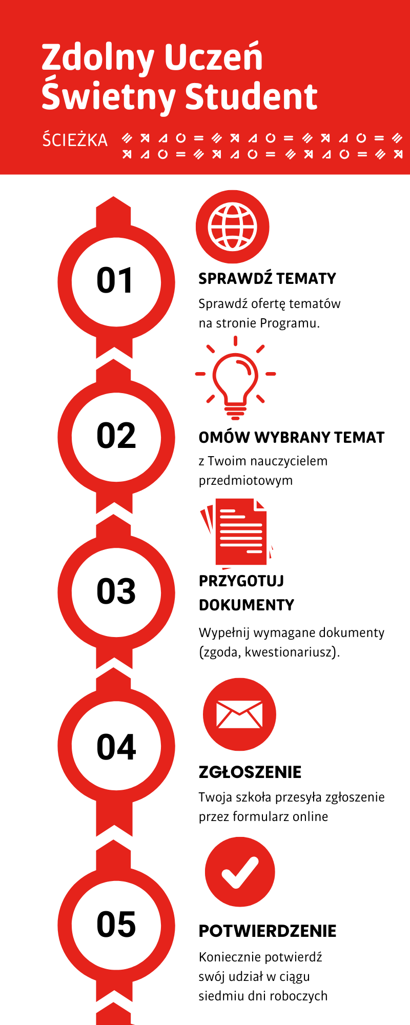 Zanim szkoła wyśle twoje zgłoszenie, zapoznaj się z ofertą tematyczną. Znajdziesz w niej bloki tematyczne zaproponowane przez poszczególne wydziały. Następnie wspólnie z nauczycielem przejdź procedurę rekrutacyjną